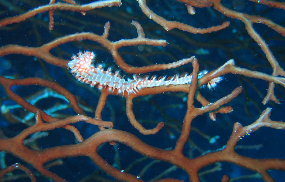 A Bearded Fireworm chomping away at the sea fan coral.