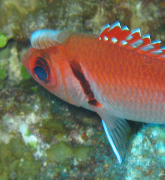 Poor soldier fish is having an embarassing day with a parasite clinging obtrusively onto its forehead.