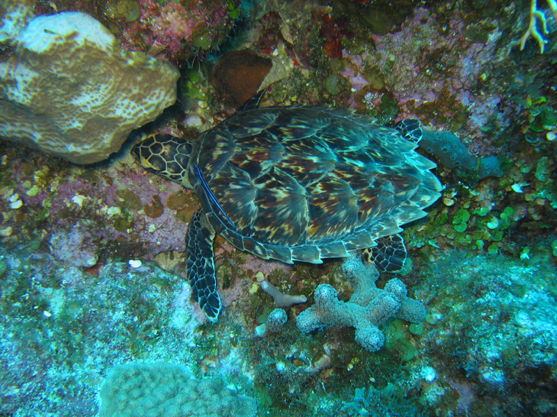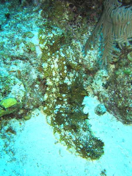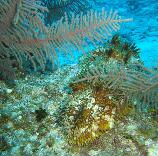 This is a hairy sea slug (about 2 foot long and 1/2 foot wide) making its way over the coral.