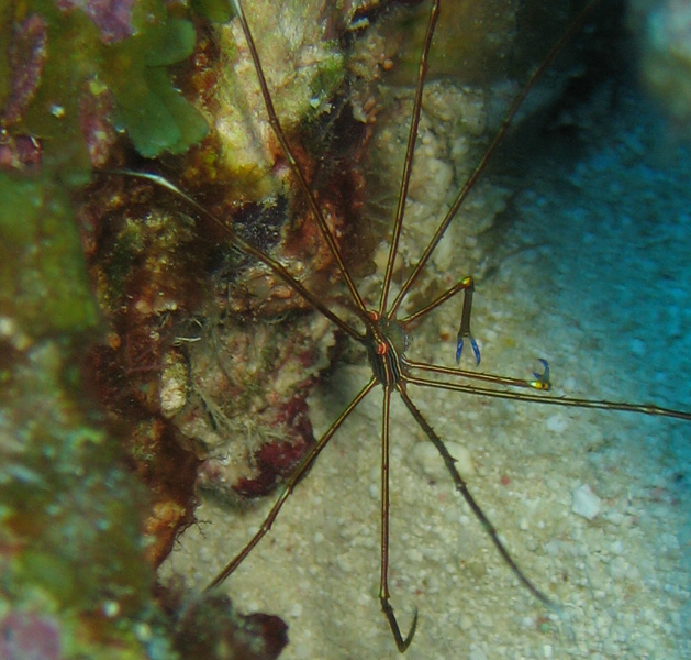 Arrow crabs... spider-like crabs with funny red eyes and blue pincers.